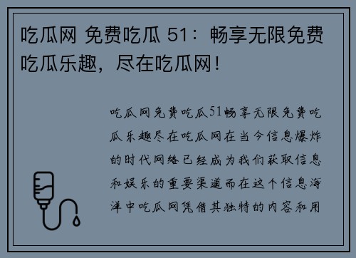 吃瓜网 免费吃瓜 51:畅享无限免费吃瓜乐趣,尽在吃瓜网! 在当今信息爆炸的时代,网络已经成为我们获取信息和娱乐的重要渠道。而在这个信息海洋中,吃瓜网凭借其独特的内容和用户体验,成为了许多人日常生...