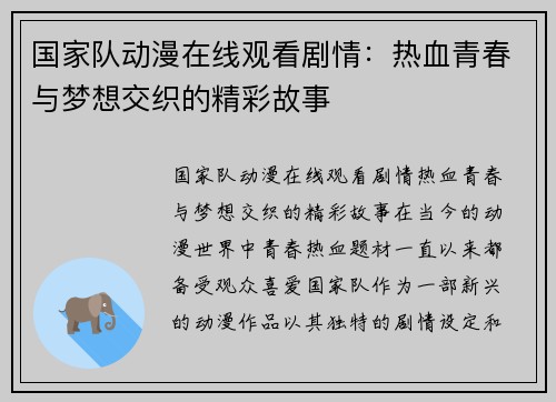 国家队动漫在线观看剧情:热血青春与梦想交织的精彩故事 在当今的动漫世界中,青春热血题材一直以来都备受观众喜爱。《国家队》作为一部新兴的动漫作品,以其独特的剧情设定和鲜明的人物形象,迅速吸引了大量观...