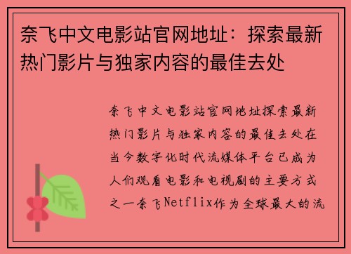 奈飞中文电影站官网地址:探索最新热门影片与独家内容的最佳去处 在当今数字化时代,流媒体平台已成为人们观看电影和电视剧的主要方式之一。奈飞(Netflix)作为全球最大的流媒体服务提供商之一,以其丰...