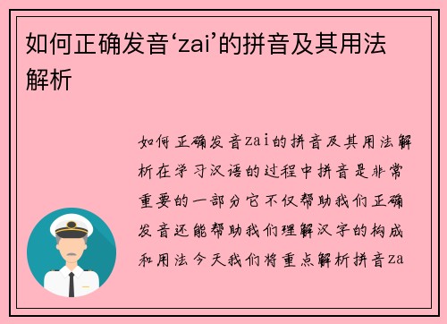 如何正确发音‘zai’的拼音及其用法解析 在学习汉语的过程中,拼音是非常重要的一部分,它不仅帮助我们正确发音,还能帮助我们理解汉字的构成和用法。今天,我们将重点解析拼音“zai”的发音及其在不同语...
